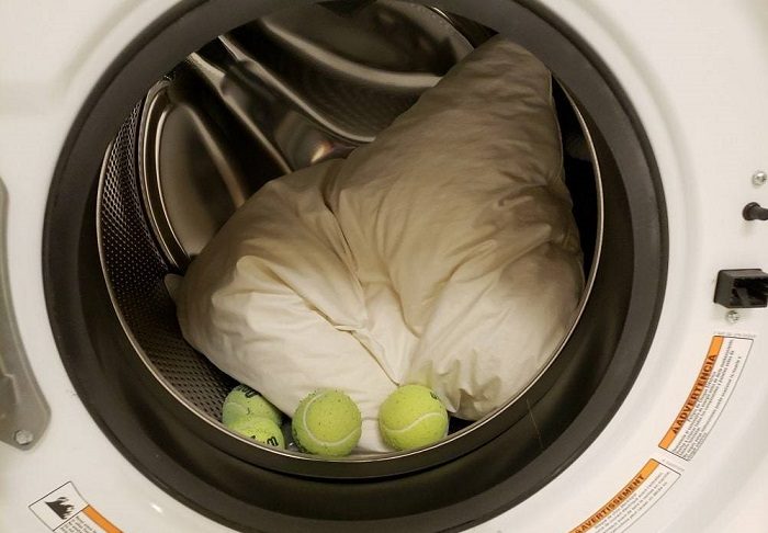 Чтобы сэкономить время, силы, а главное – нервы – предлагаем прибегнуть к одному простому лайфхаку. Положите в барабан стиральной машины несколько теннисных мячиков и только потом запускайте цикл стирки. Они не позволят материалу внутри подушек скомкаться, а значит, вам не придется думать, как его расправить.