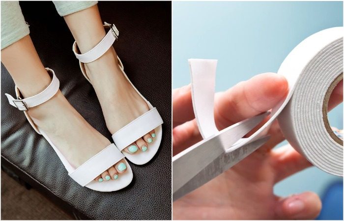 Если обувь вам нравится, и вы не хотите ее выбрасывать, попробуйте спасти ситуацию с помощью специальной клейкой ленты, одна сторона которой – липкая, а другая покрыта плотным слоем вспененного материала. Отрежьте несколько кусочков ленты и наклейте на внутреннюю сторону ремешков. Благодаря этой хитрости, разношенная обувь будет плотнее прилегать к коже и не станет слетать с ног.