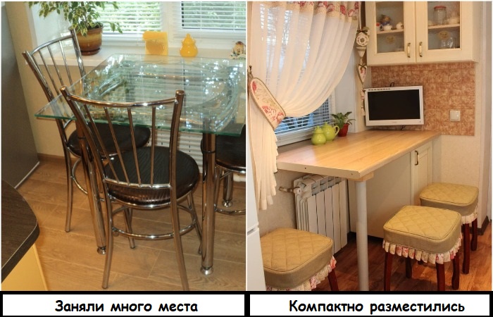Чтобы избавиться от ощущения тесноты, замените стулья табуретками. Кроме зрительного эффекта получится добиться еще и практического: когда стулья будут не нужны, их можно задвинуть под стол и освободить себе место для передвижений. В маленьких кухнях, где на счету каждый метр, это бесценно.