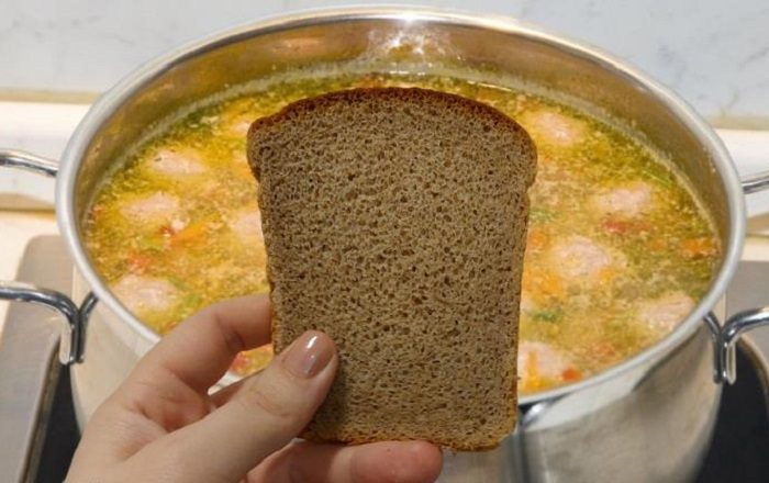 Чтобы убрать избыток соли, опустите в суп кусочек хлеба.