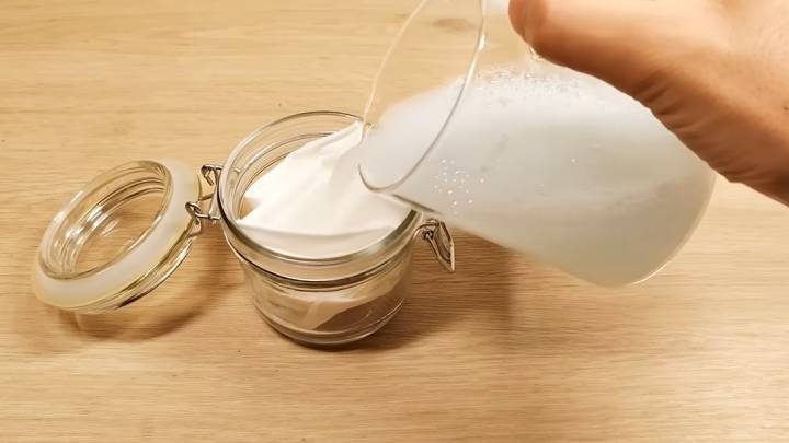 стеклянная банка.В удобную ёмкость налейте уксус 9 %. Добавьте соль, размешайте до растворения. И сюда же выдавите около 5 см любой зубной пасты, даже самой дешёвой. Размешайте до однородности.