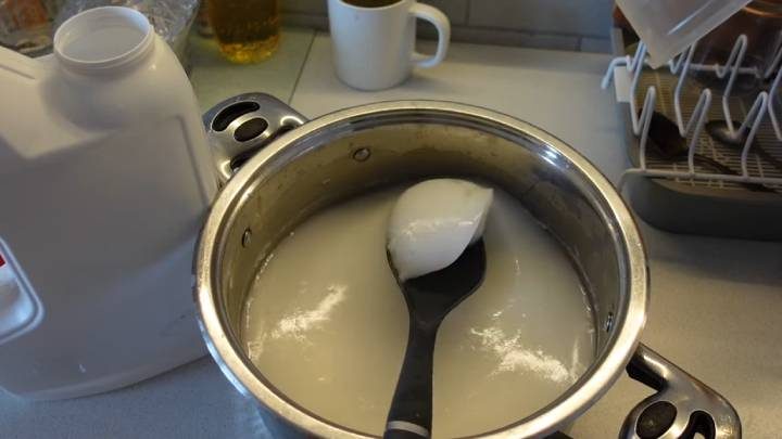 Активно помешивая, нагревайте воду. Мешайте, пока мыло полностью не растворится.