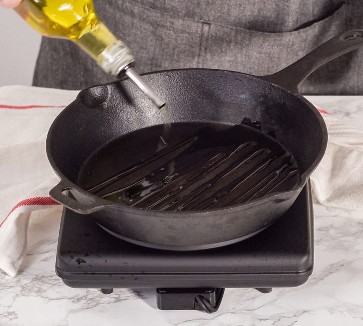 Сковорода должна иметь черную глянцевую поверхность, поэтому если она выглядит изношенной или серой, то нужно снова ее смазать. Для этого достаточно налить тонкий слой растительного масла, разогреть в горячей духовке при температуре 220 °C не менее 10 минут и оставить остывать в духовке.