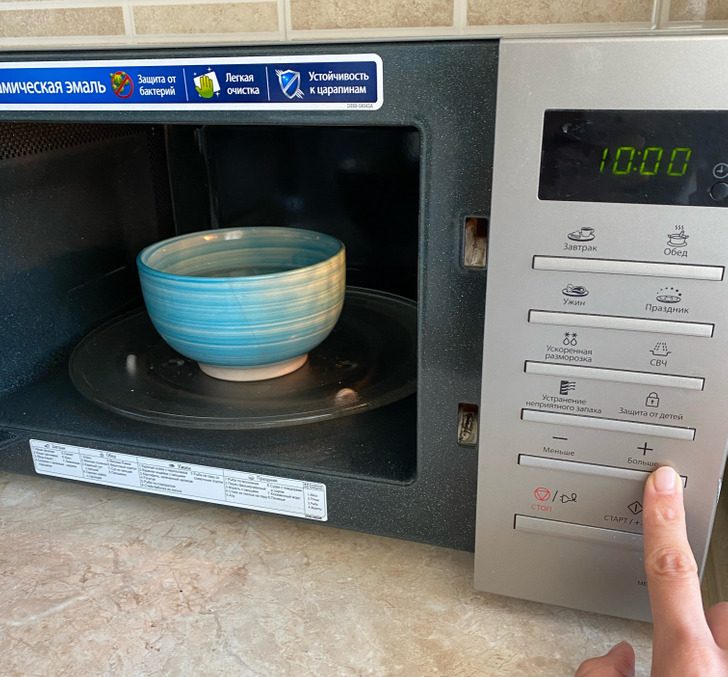 Чтобы быстро очистить внутреннюю часть микроволновой печи, достаточно отпарить грязь. Нужно поставить в микроволновку миску с водой и разогревать ее на высокой мощности в течение 2 минут или положить смоченное водой полотенце и также пропарить его внутри в течение 5 минут. От этого внутри образуется пар, и любые брызги можно будет легко удалить влажной тряпкой.