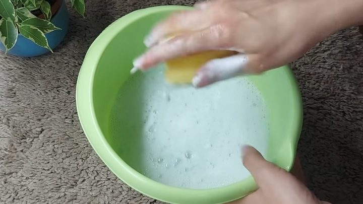 Когда вода немного остынет, смочите губку в растворе и почистите ковёр.
