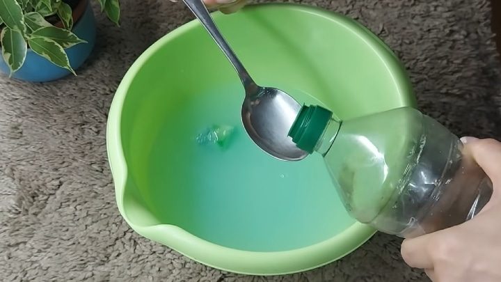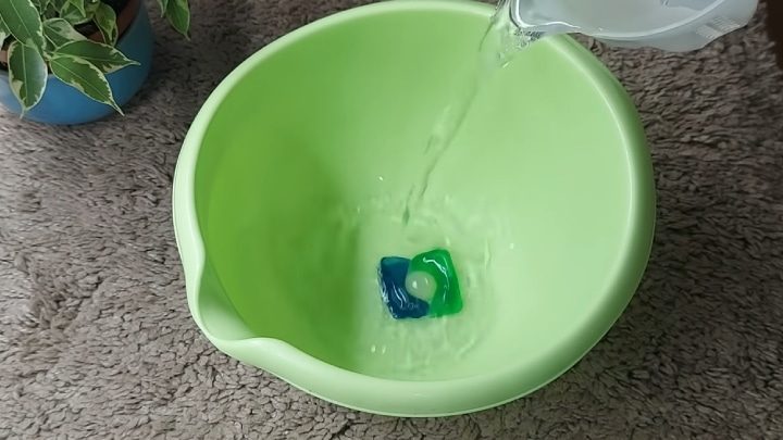 Возьмите таблетку или капсулу для стирки в машинке, залейте 1 л кипятка.