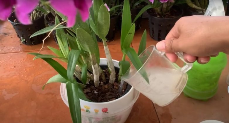 Рисовая вода также подходит для полива растения под корень или для замачивания горшка с орхидей в течение 15 минут.