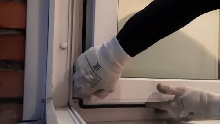 Откройте окно на проветривание и вставьте кончик новой резины в самое проблематичное место створки — наверх. Здесь придётся действовать наощупь, потому что только в приоткрытом виде на форточку можно зафиксировать здесь новую резинку.