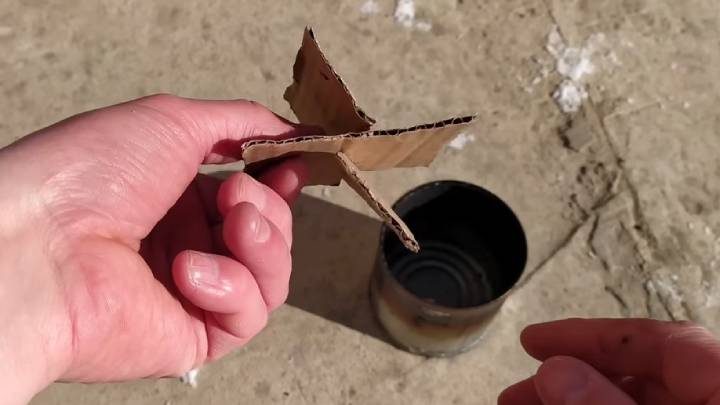 Два куска картона надрежьте до половины по центру. Соедините — получится импровизированный фитиль. Вставьте в консервную банку.