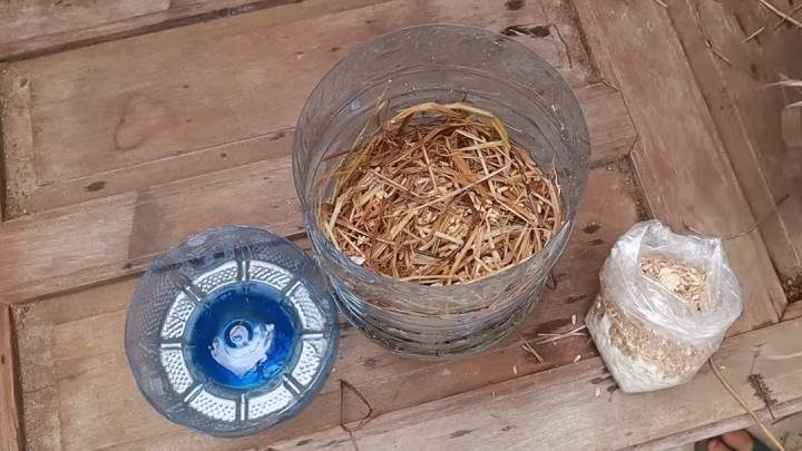 Переверните бутылку. Уложите слоями влажную солому и пересыпьте зерновым мицелием.