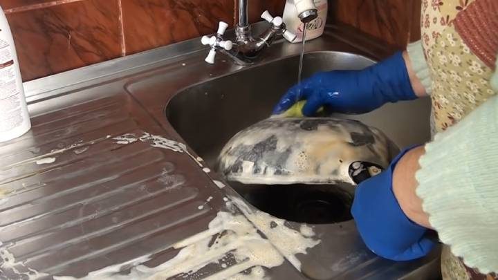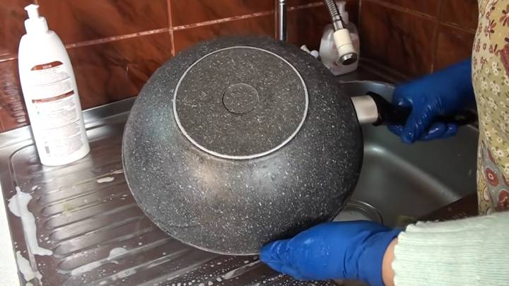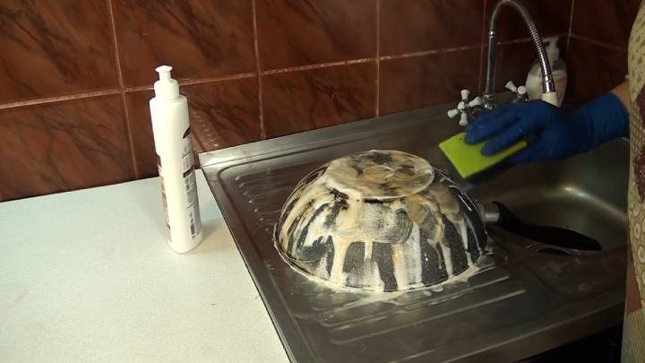 После этого помойте посуду под проточной водой. Обязательно работайте в перчатках! Возможно, понадобится добавить моющее средство для посуды, чтобы удалить остатки размякшего нагара.