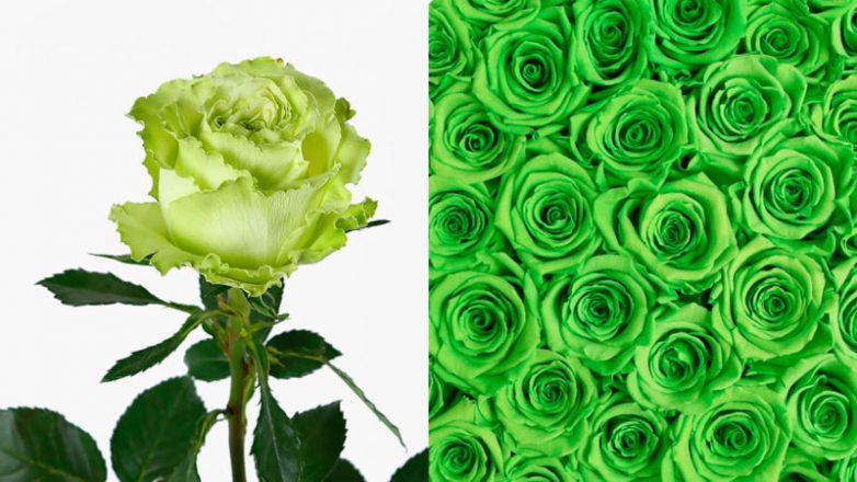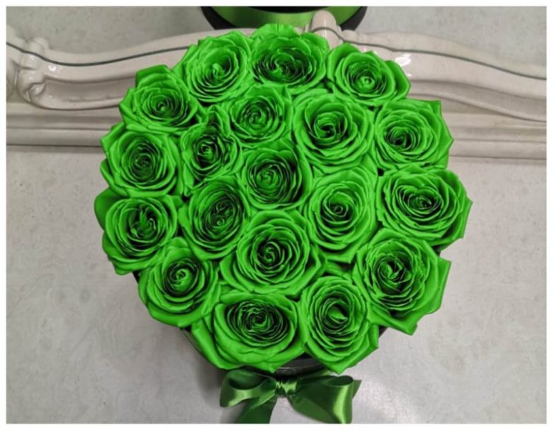 Розу можно искусственно окрасить в зеленый цвет. Это можно сделать с белой розой, которую получится покрасить в любой оттенок зеленого. Это отличная идея для тематических украшений интерьера.