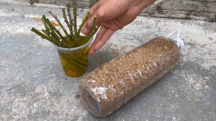 Подготовьте горшок для роз. В бутылке сделайте окошко. На противоположной стороне — отверстия для слива лишней воды. Внутрь насыпьте песок и высадите черенки.