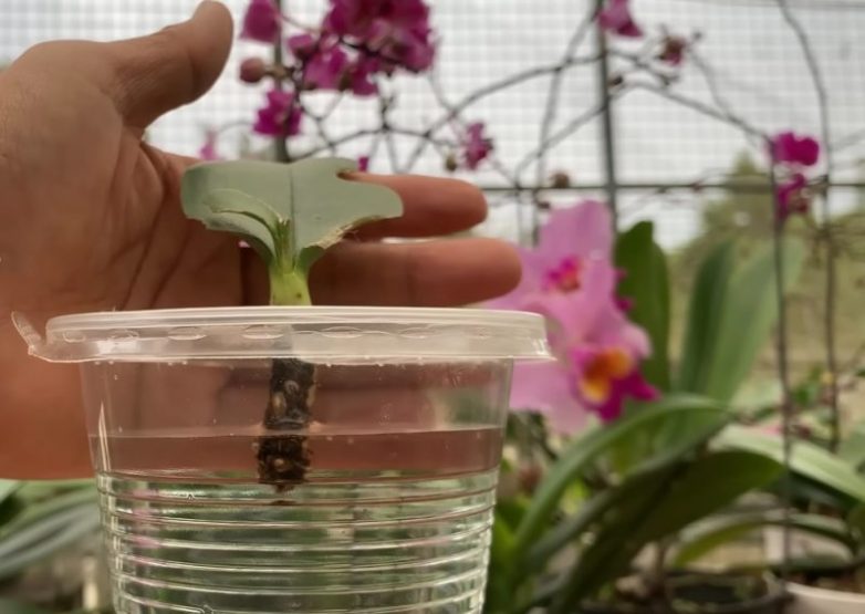 Накройте орхидею срезанным горлышком от пятилитровой бутылки, следите за уровнем воды и раз в 3 дня обрызгивайте лист. В таких условиях корневая система орхидеи начнет развиваться очень быстро.