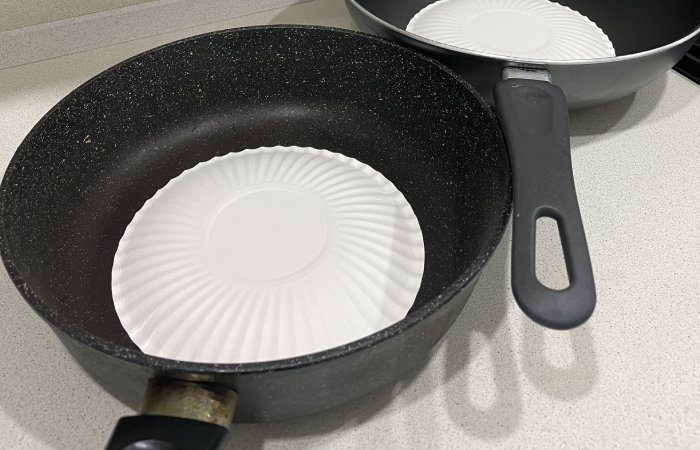 Наверняка после праздников у вас оставались лишние бумажные тарелки, которые хранятся в дальней части шкафа. Вот именно они то нам и понадобятся. Необходимо накрыть бумажной тарелкой дно сковороды. Тогда сверху вы сможете поставить ещё одну, не боясь за сохранность антипригарного покрытия. Таким образом, вы сохраните сковородки, и они будут занимать меньше места в шкафу.