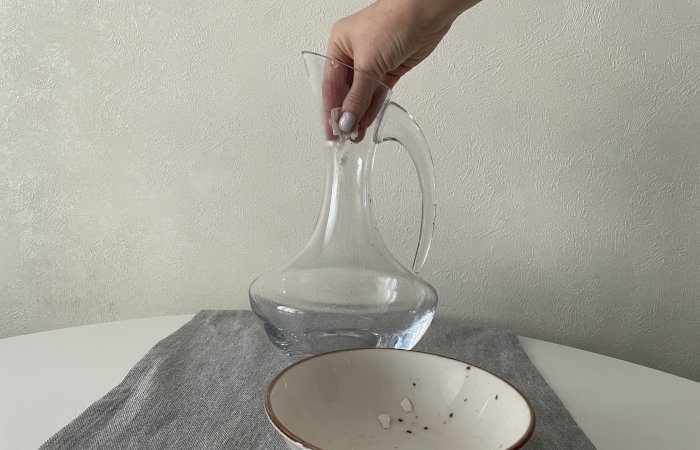 Вам понадобиться лишь яичная скорлупа. Залейте в графин немного горячей воды и средство для мытья посуды. А после покрошите немного яичной скорлупы. После чего как следует покрутите и взболтайте графин. Скорлупа выступит в качестве скрабирующих частичек и легко отмоет ваш графин.