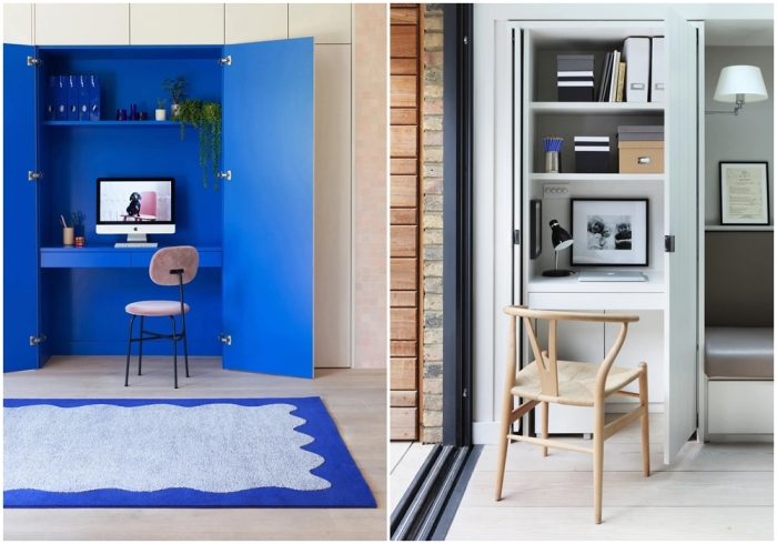 Кто бы мог подумать, что за обычными дверцами шкафа скрывается самое настоящее дизайнерское произведение искусства, наполненное ярким цветами и оттенками, которые сделают рабочий день ярче и веселее. Скучные нейтральные цвета и приглушённый свет предназначены для офисных помещений, но в домашнем офисе можно создать то рабочее пространство, которое будет радовать глаз, бодрить и вдохновлять.