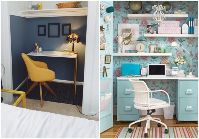 Хорошее освещение необходимо для любого домашнего офиса, а тем более для того, который находится либо в шкафу, либо в гардеробной – там, где вы потенциально имеете дело с очень тусклым освещением. Используйте несколько источников освещения от настольной лампы и бра, до пары торшеров, которые будут давать дополнительный боковой свет при необходимости. Если же места недостаточно, то повесьте плоскую лампу-трубку над вашим рабочим столом с регулятором мощности свечения.