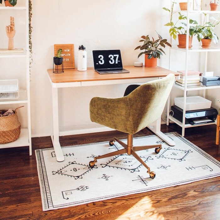 Напольный коврик в рабочем кабинете — разумный способ придать помещению комфорт и очарование, а также создать уютную и комфортную атмосферу. Ко всему прочему, он будет сохранять и удерживать тепло, а также поглощать большую часть посторонних шумов. Сделайте замеры, чтобы подобрать соответствующий размер коврика и максимально комфортно расположить его в мини-офисе. Лучше всего подойдут покрытия с низким ворсом или с плоским плетением, поскольку они занимают не сильно много места в ограниченном пространстве.