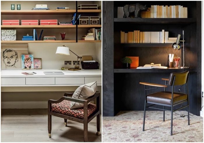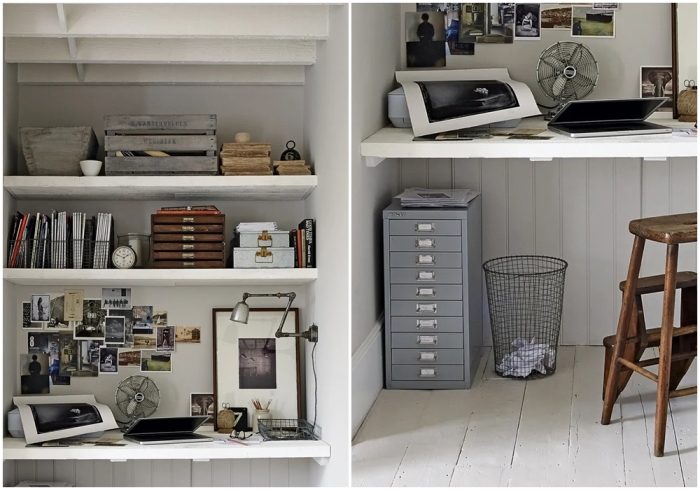 Независимо от того, шкаф это или часть гардеробной, важно чтобы в вашем офисе не было беспорядка, а это означает обеспечение максимального пространства для хранения. Не ограничивайтесь только полками, по возможности присмотритесь к небольшому пеналу с выдвижными ящиками, которые аккуратно задвигаются под стол, или к небольшому настенному шкафу, если у вас есть место. Если полки — единственный выход, используйте органайзеры для хранения различных мелочей, документов и прочих рабочих вещей.