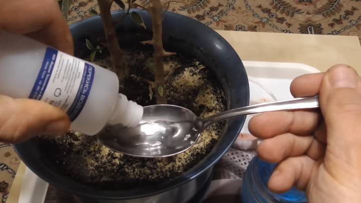 Теперь разведите 1 ст. л. аптечной перекиси водорода 3 % в 1 л воды. Увлажните почву из пульверизатора данным раствором. Это также способствует дезинфекции и естественному очищению грунта.