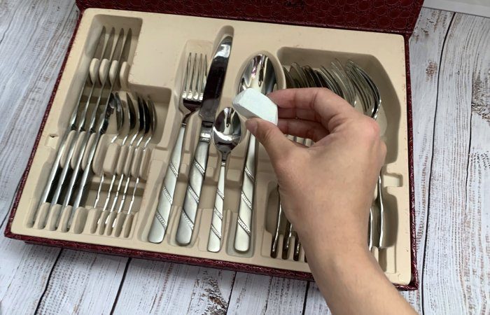 Чтобы не испортить внешний вид вашего наследства, вам потребуется лишь кусочек мела. Его следует обернуть в марлю и положить в ящик со столовым серебром. Удивительно, но такое простое действие не позволит вашим столовым принадлежностям покрыться темным налетом.