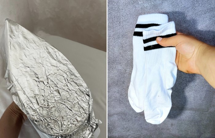 Просто сбрызнете носки лаком для волос. После чего просушите их феном. Такое действие позволит образоваться на поверхности ткани защитному слою. Он будет защищать носки от прилипания грязи, и они долгое время останутся белоснежными.