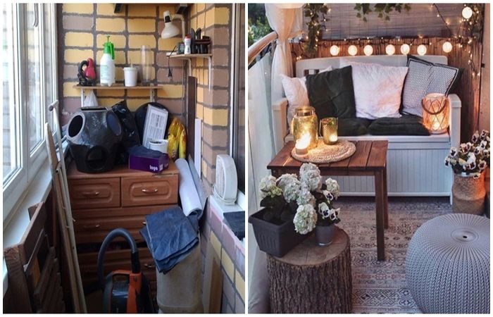 Прежде чем приступить к обустройству балкона в зону для отдыха, его стоит привести в порядок. Вынести весь хлам, избавиться от скопившегося мусора и ненужных вещей. А после провести уборку: вымыть окна, подоконники, полы и стены. Пройтись щёткой и влажной тряпкой по потолку и только после всего этого привносить уют.