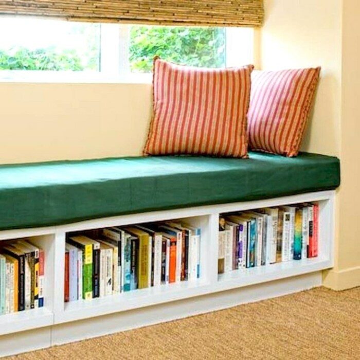 Седьмой вариант — банкетка у окна. Если места у окна, предлагают комфортное сидение, почему бы не использовать их в качестве места хранения книг? Установив специально оборудованную банкетку у окна и под ней разместить полки для книг. Таким образом, Можно наслаждаться чтением, находясь рядом с прекрасным видом за окном.