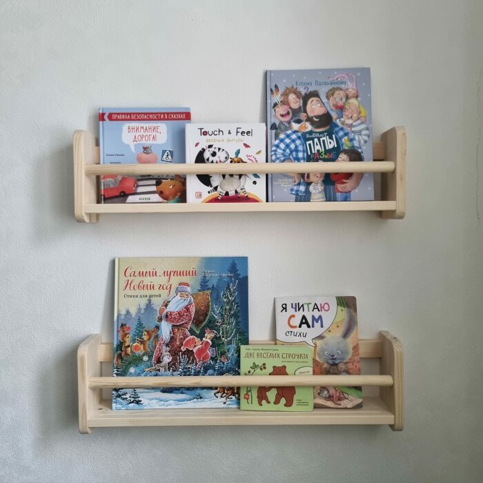 Пятый вариант — полка Монтессори. Чтобы книги были легко доступны их можно поставить на прямую полку. Такая полка также называется полкой Монтессори. Многие родители предпочитают использовать такие полки в детских комнатах, чтобы дети видели не только скучные корешки книг, но и красочные обложки. Это способствует развитию у детей интереса к чтению. Плюсы этого метода хранения — доступность книг, с их помощью можно создать яркий декоративный уголок, сразу видно, что за книгу ты берёшь.
