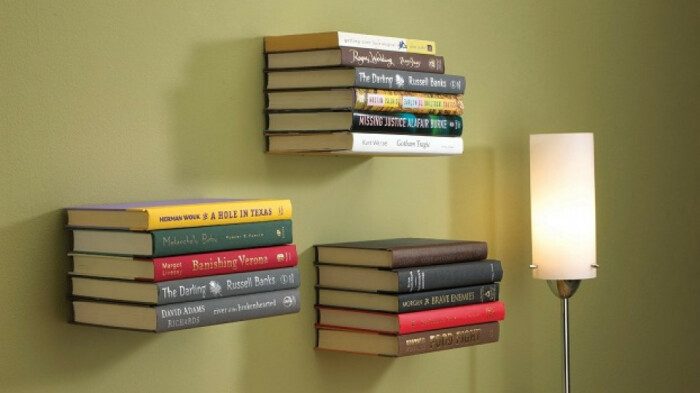 Четвертый вариант — невидимая полка. Возможно, это слишком художественное решение? Однако, необычность и минимализм этого способа хранения могут привлечь внимание даже самых требовательных ценителей книжного искусства. Книга надевается на специальный крепёж в стене обложкой и держит на себе все остальные книги, которые кладутся сверху.
