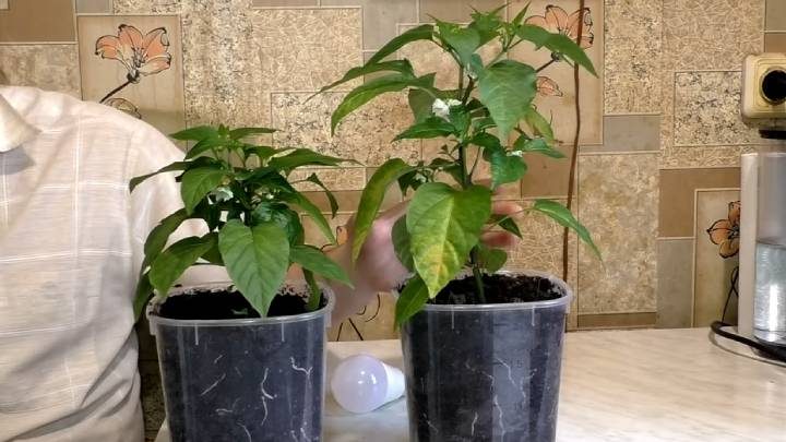 Также фитолампы нельзя назвать универсальными. К примеру, популярный биколор подходит для детерминантных помидоров (куст получается низким и толстым), но если вы также выращиваете обычный перец или огурец, то для них эта лампа (довольно дорогая!) уже не является эффективной (слишком медленное развитие). Пример — на фото ниже. Слева — перец, выращенный под фитолампой, справа — под обычной белой лампой. Желтизна на листьях появилась лишь вследствие слишком быстрого роста (хозяин не успел пересадить в горшок большего размера; растение чересчур разрослось и начало брать питание из листьев). Возраст перцев одинаковый. Выводы, как говорится, каждый делает сам для себя.