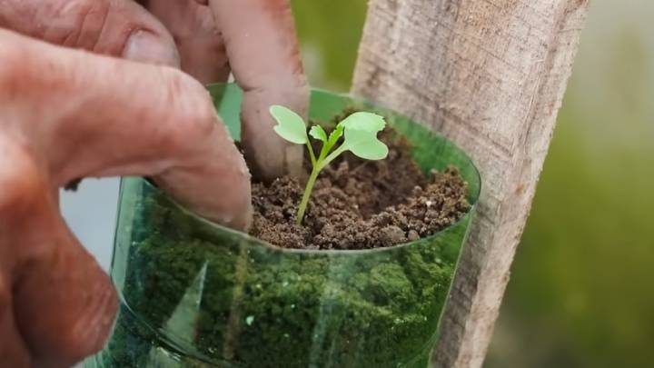 Приподнимите горлышко, а на дно налейте воду. Поставьте половинку обратно, также слегка увлажните грунт. Теперь его не нужно поливать — влага будет поступать снизу.