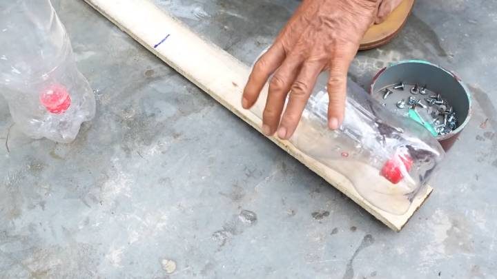 Внутрь вставьте (не прикручивайте) половинку бутылки с горлышком. Доски выставите на улицу.