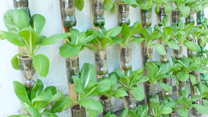 Просто прикрутите бутылки к доскам, посадите семена и постоянно собирайте урожай в малоуходном вертикальном огороде.