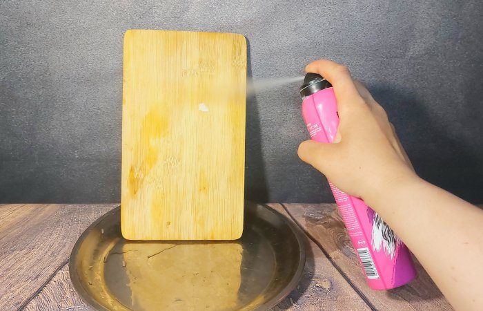 На самом деле с помощью лака для волос действительно можно справиться с пятнами на любимой деревянной разделочной доске. Дело в том, что не все пятна легко уходят с деревянной посуды. Именно тут на помощь приходит лак. Его следует распылить по всей поверхности доски и дождаться, когда он высохнет. После чего поместить разделочную доску в тёплую мыльную воду. Лак будет отходить вместе с пятнами, которые вам не удавалось вывести ранее. А вы получите абсолютно чистую разделочную доску.