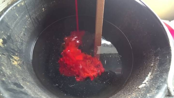 Далее в раствор отправляется березовый деготь. Его добавьте 40 мл. В конце влейте ранее приготовленные растворы золы и янтарной кислоты.