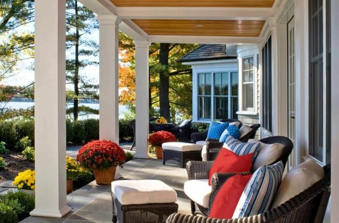 Главным элементом крытой террасы является крыша, которая должна защищать площадку не только от прямых солнечных лучей, создавая желанную тень, а и от непогоды. Если нет возможности возвести полноценную крышу, то можно рассмотреть варианты с выдвижными крышами, шатрами и натяжными тентами. В современном мире огромный выбор достаточно прочных и износостойких материалов и конструкций, таких как: стекло, ударопрочный пластик, бамбук, водоотталкивающая ткань с пропиткой и др. А чтобы вдохнуть в террасу жизнь и уют, можно поставить небольшой мягкий диванчик, пару пуфов, небольшой столик или же обзавестись качелями с мягкими декоративными подушками. Лишними не будут вазоны с неприхотливыми цветами, свечи и фонарики разной мощности, расставленные по периметру.