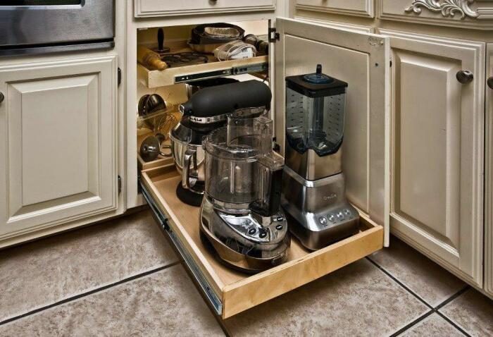 Можно установить выдвижные столешницы, чтобы увеличить рабочую зону. Однако, стоит учитывать, что выбор бытовой техники для узких шкафов ограничен, предпочтение можно отдать технике с хромированными деталями и поверхностями.