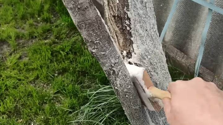 С настоявшимся раствором консистенции густой сметаны легко работать! Нанесите его на ствол дерева кистью, начиная снизу.