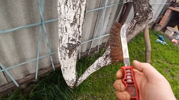 Перемешайте и оставьте раствор на 30 минут, чтобы он настоялся. Тем временем подготовьте деревья к побелке. С помощью жёсткой щётки зачистите поверхность от старого покрытия, не повреждая кору.