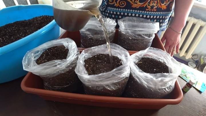 Для увлажнения земли в тёплую воду добавьте пару капель любой жидкой подкормки с гуматами. Вносите по инструкции на упаковке. Посадите по семечку в каждый пакет. Для удобства их можно подписать.