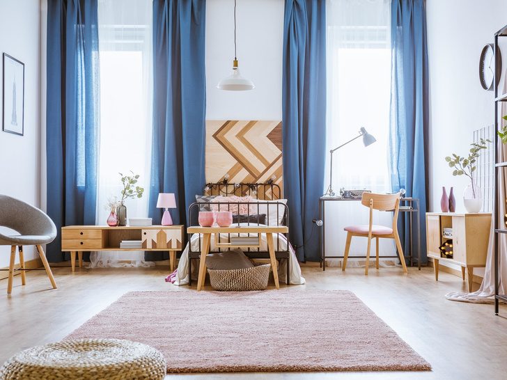 Узор: если у вас обои с рисунком, то шторы лучше выбрать однотонные. Работает правило и в обратную сторону: если стены без рисунков, шторы можно выбрать с узором. Чтобы не перегружать интерьер во втором случае, стоит выбирать шторы с геометрическим принтом, это поможет визуально изменить пространство. Вертикальная полоска визуально сделает комнату выше потолка, а горизонтальная расширит пространство.