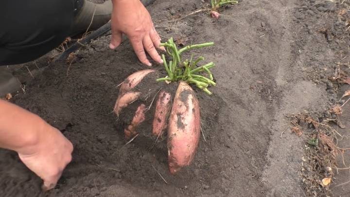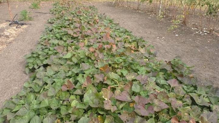 Плёнка также убирается на хранение — она послужит не один сезон. Расстояние между лунками — 50 см. Никаких специфических обработок от вредителей батату не требуется: это очень стойкая и урожайная культура.