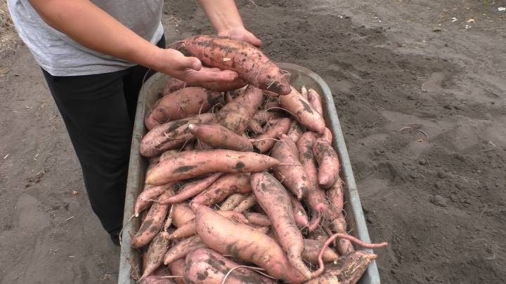 Собирается урожай следует аккуратно, так как клубни батата довольно хрупкие, с тонкой кожицей. Хранятся при температуре +12..+18 градусов. Ниже — портятся и гниют, выше — начинают прорастать. Оптимальная влажность воздуха для хранения — 50-80 %. В таких условиях цельные клубни батата спокойно пролежат до следующего сезона!