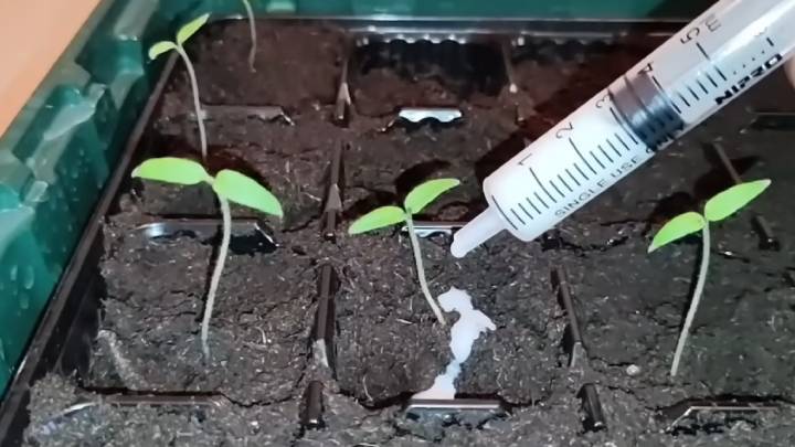 Это удобрение ничуть не хуже комплексного. При этом полностью натуральное! Возьмите натуральное молоко (100 мл) и воду (1 л). Если у вас немного рассады, то можно взять меньше. Главное — соблюсти пропорцию молока с водой 1:10.Как известно, молодую рассаду нельзя заливать. От этого корешки гниют и росточки быстро погибают. Поэтому будем подкармливать с помощью шприца!