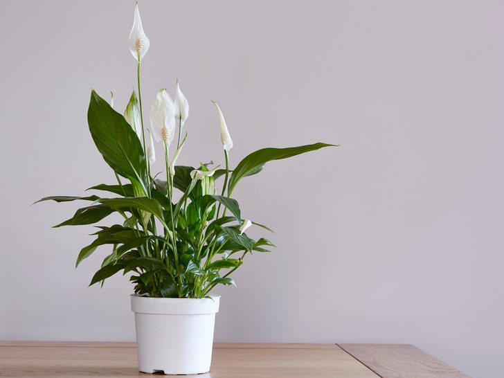 Спатифиллум иногда называют «женским счастьем», а на английском это «лилия мира». Пожалуй, это одно из самых простых в уходе растений. Оно предпочитает яркий непрямой солнечный свет, но может переносить и более низкие уровни освещения, так что его не обязательно держать на подоконнике. Иногда спатифиллум может цвести — обычно летом. Тогда появляется белый цветок, напоминающий лилию. В зимние месяцы эти комнатные растения находятся в состоянии покоя, а растут весной и летом, когда им требуется более тщательный уход и частый полив. Тем не менее, спатифиллум не подойдет вам, если у вас есть домашние животные, так как им он грозит интоксикацией.