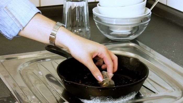 Сковороду можно помыть использованным чайным пакетиком.