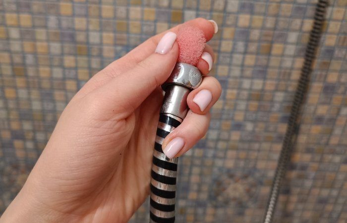 Отрежьте небольшой кусочек губки для мытья посуды. Скрутите его в цилиндр и вставьте в шланг. Закрутите шланг и включите большой напор горячей воды. Под давлением она буквально вытолкнет всю грязь из шланга наружу. Такое простое действие позволит почистить душ за пару минут.
