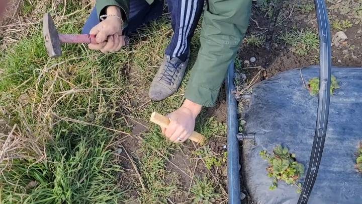 Такие нехитрые манипуляции нужны для того, чтобы плёнку было удобно приподнимать, проветривать парник и ухаживать за кустами клубники! А затем с такой же лёгкостью плёнку можно опустить на место — она будет прочно зафиксирована.